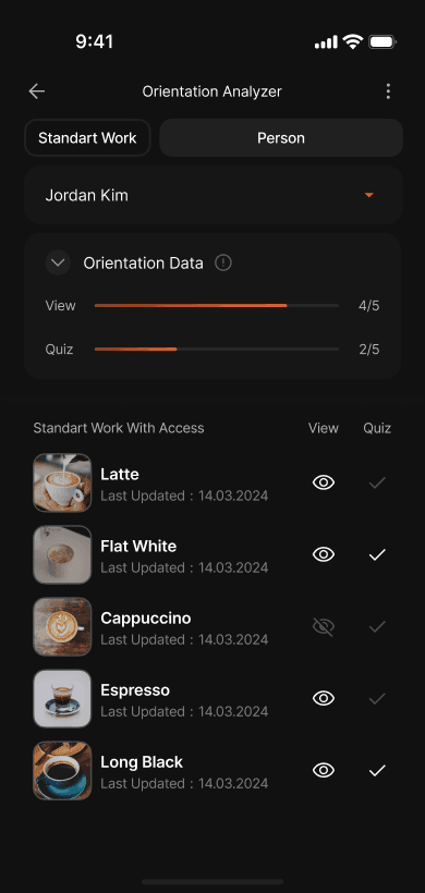 Use AI to automatically generate quizzes from your standard work and videos, so you can instantly see who understood the process and who needs support.